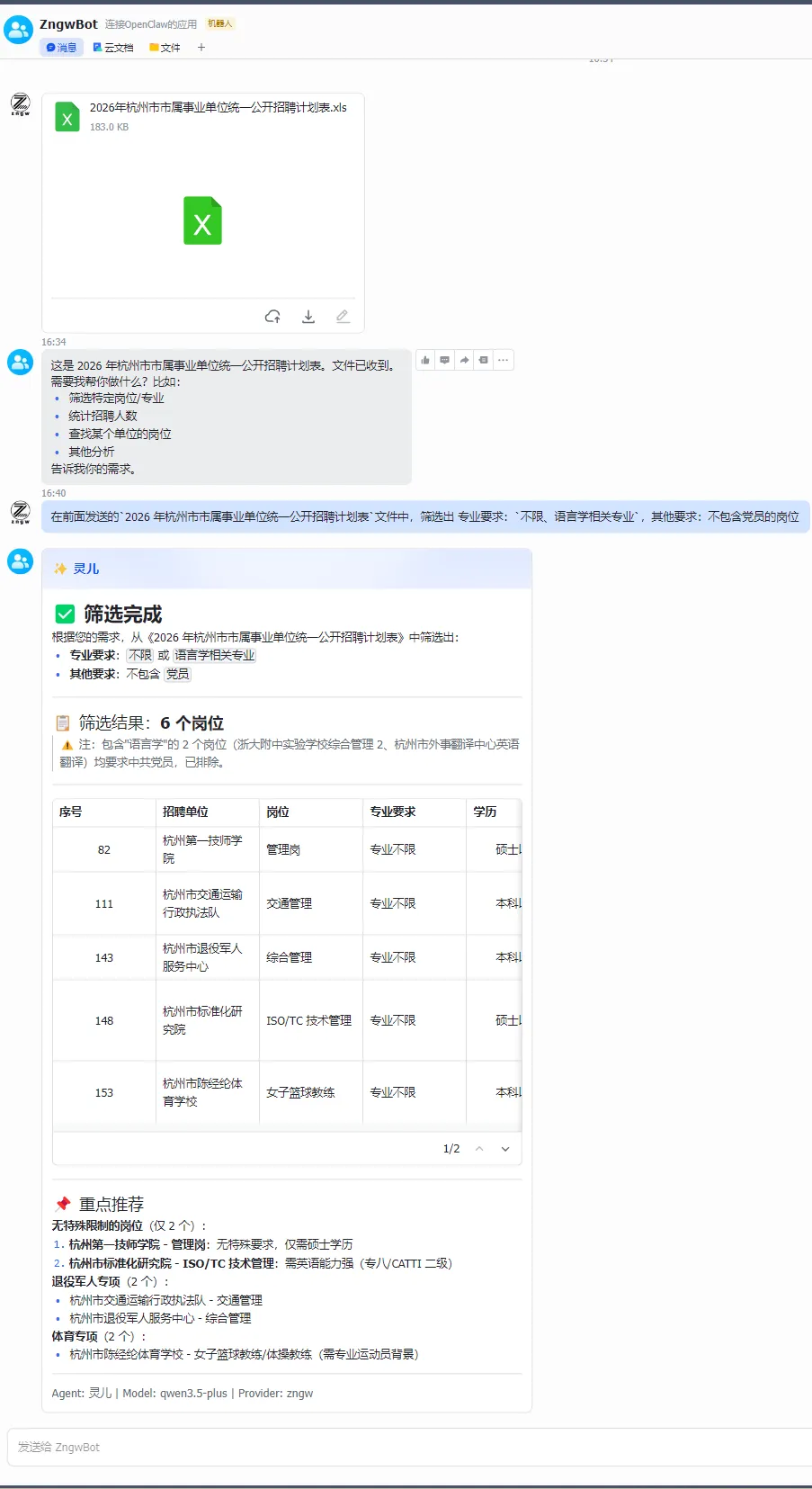 最近媳妇打算考公,让后把表格和需求发过小龙虾,让它帮你筛选出符合条件的岗位。