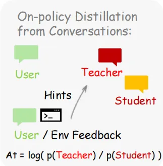 论文提出的Hindsight-Guided On-Policy Distillation(OPD)正是为了解决这个问题。它的做法是:从下一状态中提取出这种指令性的“提示”(hint),把这个提示加到原始prompt里,让模型重新生成一次回答,然后比较两次生成每个token的概率差异。如果模型在“知道提示后”更倾向于某些token,那这些token就是应该被加强的;反之则是应该被抑制的。这相当于给每个token提供了一个方向性的梯度,而不仅仅是一个整体的+1或-1。