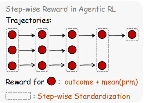 论文使用一个PRM(过程奖励模型)来判断每一步的好坏,取多次投票的多数结果作为最终标签。这种做法在数学推理任务中已经被验证过,但作者将它扩展到了更通用的场景——终端操作、GUI交互、SWE任务、工具调用——这些环境中同样充满了可以被解读为奖励或惩罚的信号。