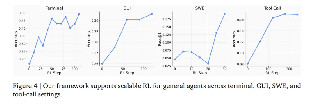 (2)General Agent track则展示了同一套基础设施如何支持终端、GUI、SWE和工具调用四种不同类型的agent训练。