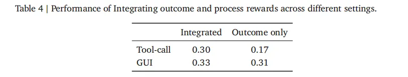 当128个并行终端环境、64个GUI/SWE环境、32个工具调用环境同时运行,过程奖励的加入在tool-call任务上把准确率从0.17提升到0.30,GUI任务从0.31提升到0.33。