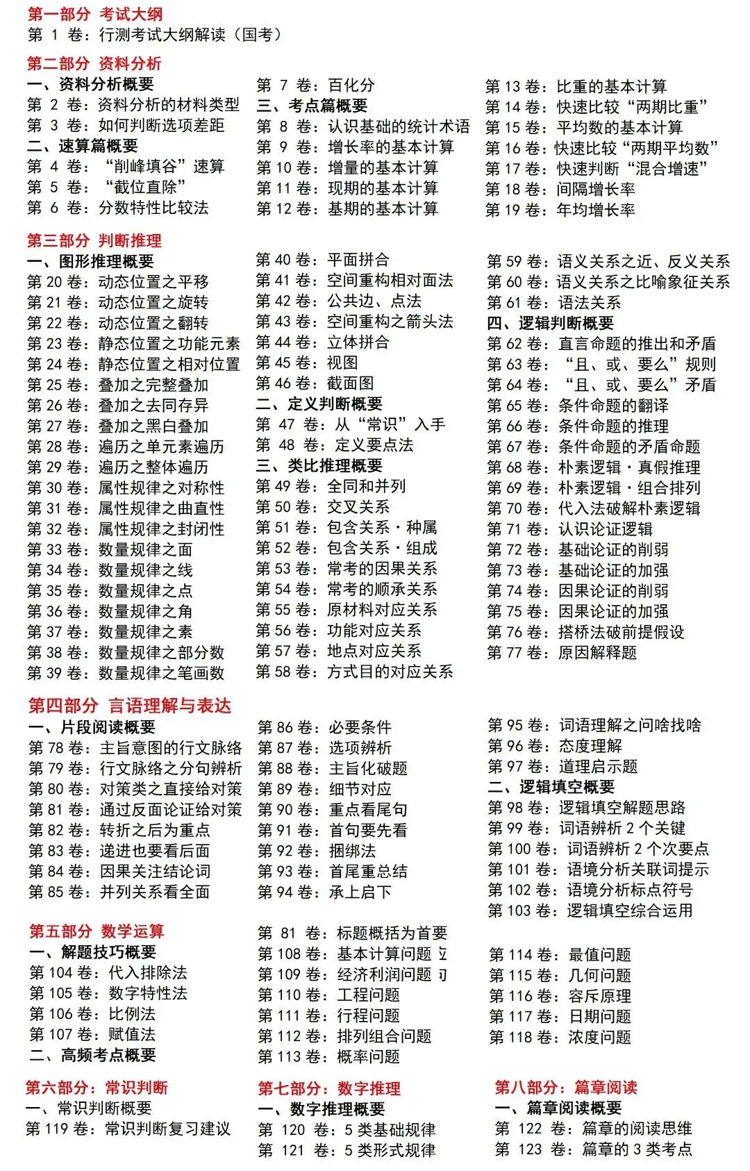 数学运算的常规考点包括高频和低频两类。高频考点,属于近5年国、省考基本每年都有考查的知识点,主要包括:基本计算、工程、行程、经济利润、最值、几何、排列组合、概率问题这八大考点。低频考点,为近5年国、省考偶考的知识点,主要有:容斥原理、周期日期、鸡兔同笼、植树问题等。