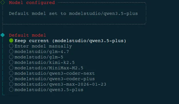 Keep current (modelstudio/qwen3.5-plus) ← 这是当前默认 Enter model manually ← 手动输入 modelstudio/glm-4.7 modelstudio/glm-5 modelstudio/kimi-k2.5 modelstudio/MiniMax-M2.5 modelstudio/qwen3-coder-next modelstudio/qwen3-coder-plus modelstudio/qwen3-max-2026-01-23 modelstudio/qwen3.5-plus