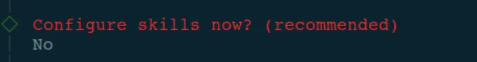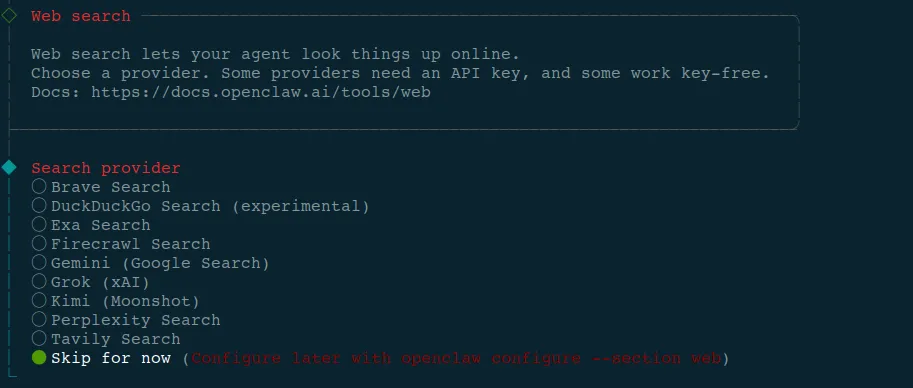 网页搜索和技能,可以先不设(大部分要么国内不可用,要么需要技能单独 API),后边让 openclaw 自己安装国内可用的技能也可以,我选的 skip for now 跳过。