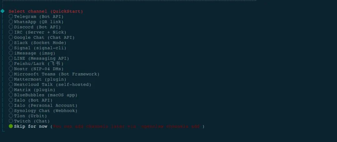 选择频道插件,这里可以先不设,有需要后边从各插件官网复制配置到 openclaw.json 更好: