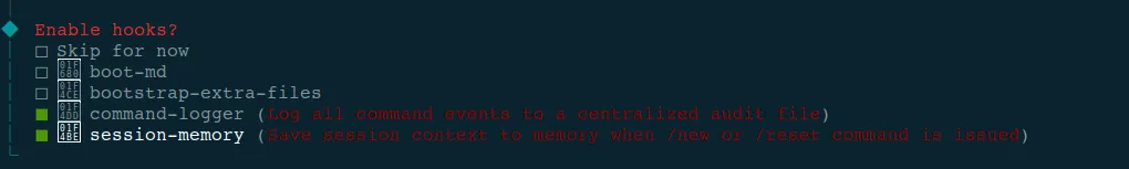 下一步配置初始勾子,按需选择即可(按空格键选中选项,选完回车即可),暂时不选后边在 openclaw 单独配也行: