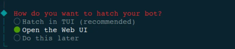 推荐选择第三个:暂不打开,后续通过飞书/企业微信等官网配置手册接入飞书/企业微信等后再通过飞书/企业微信等对话(tui终端命令对新手不友好,麒麟服务器版本没有高版本浏览器用不了 web ui)。