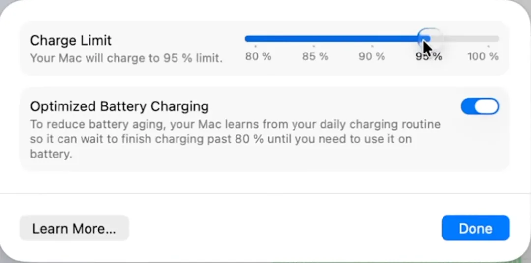 你现在可以把 MacBook 的充电上限设置在 80% 到 100% 之间,每档调节幅度为 5%。
