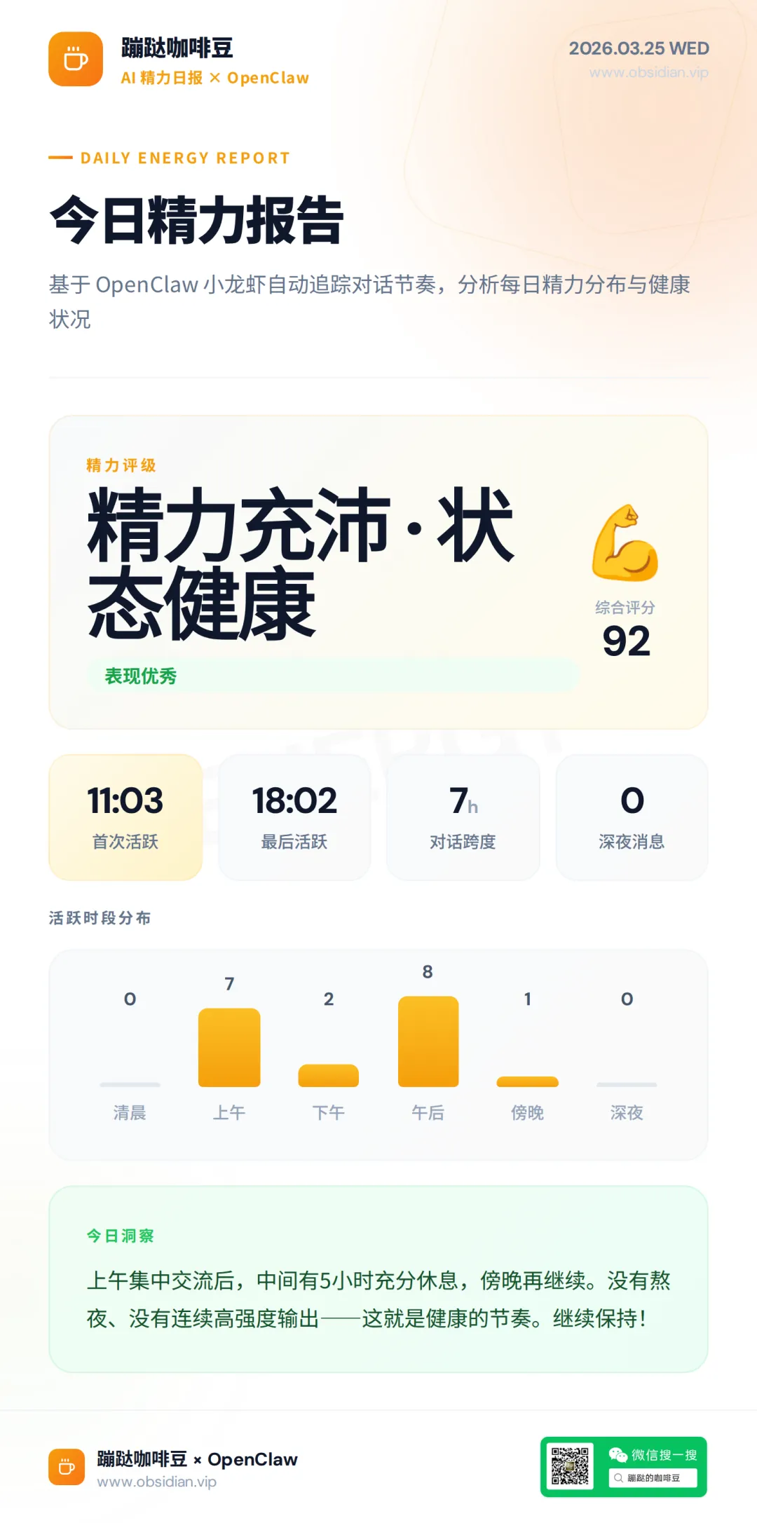 它在后台默默看着我的日常对话节奏,到晚上自动发一份精力日报📚——今天几点开始聊的、中间有没有休息、精力状态打几分,全给你分析好了📊