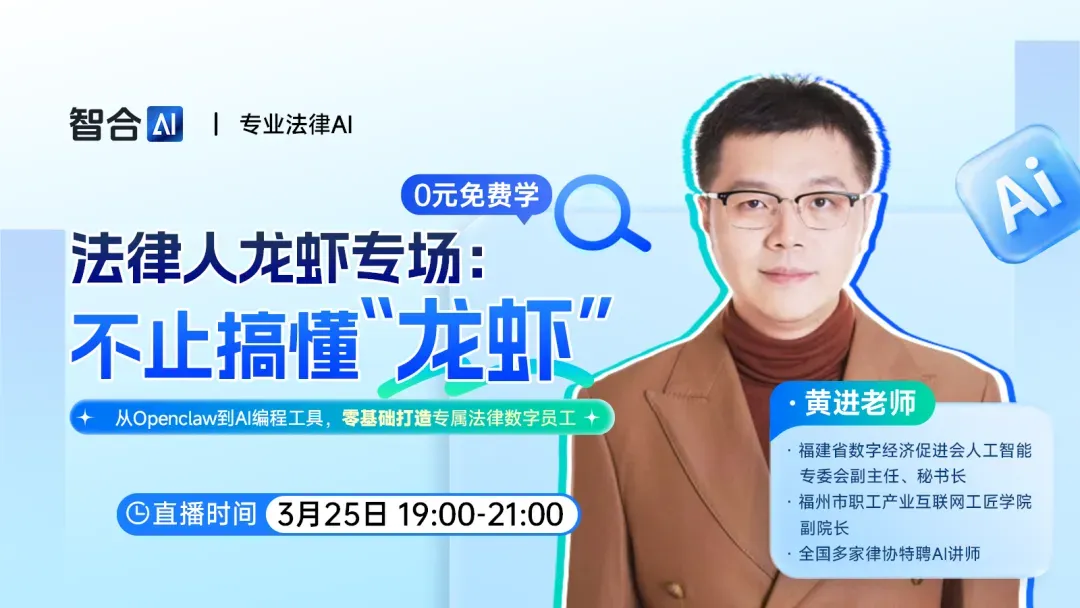为此,针对以上问题,智合AI特邀AI法律实战专家、全国多家律协特聘AI讲师——黄进老师,带你不止搞懂“龙虾”,更能直接从openclaw到AI编程工具,零基础打造你的专属法律AI员工,并且绝对安全。