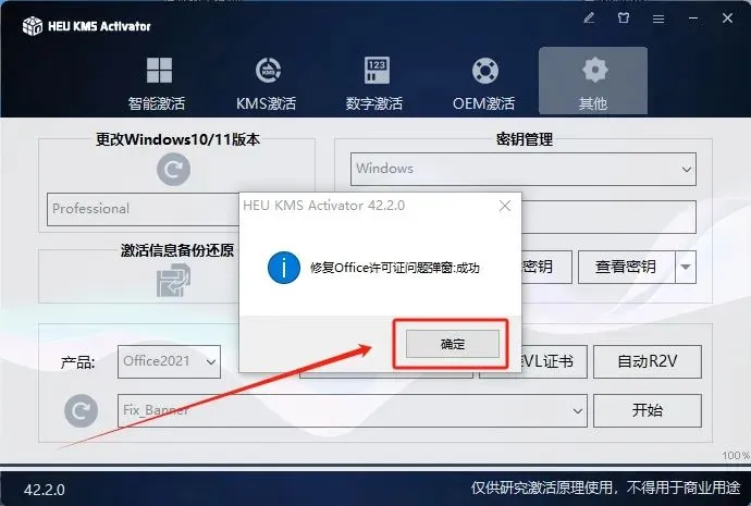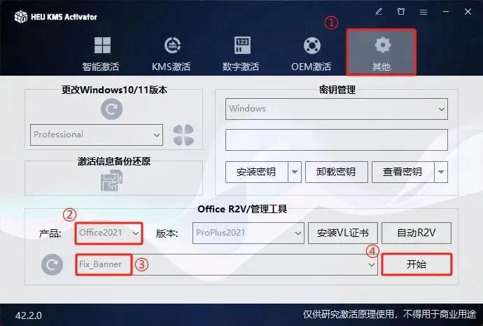 6.修复许可证弹窗:点击【其他】,产品选择【Office2021】,选择【Fix_Banner】点击【开始】。