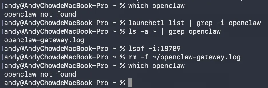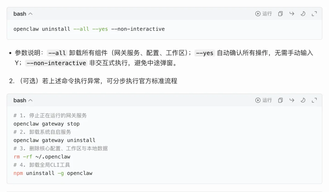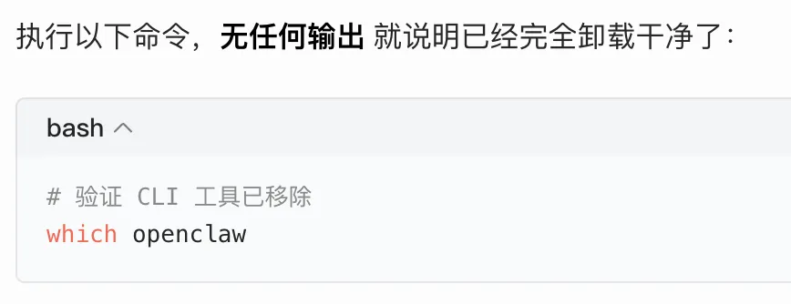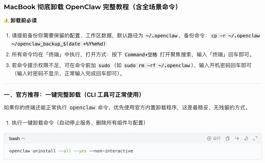 卸载OpenClaw只要1秒钟!一个命令!首先问下AI(此处用了豆包),如何卸载OpenClaw我现在想要卸载安装在我macbook上的openclaw,给我出一个教程,包含命令openclaw uninstall --all --yes --non-interactiveopenclaw gateway uninstallnpm uninstall -g openclawlaunchctl list | grep -i openclaw # 4. 验证默认端口无占用(OpenClaw默认占用18789端口)