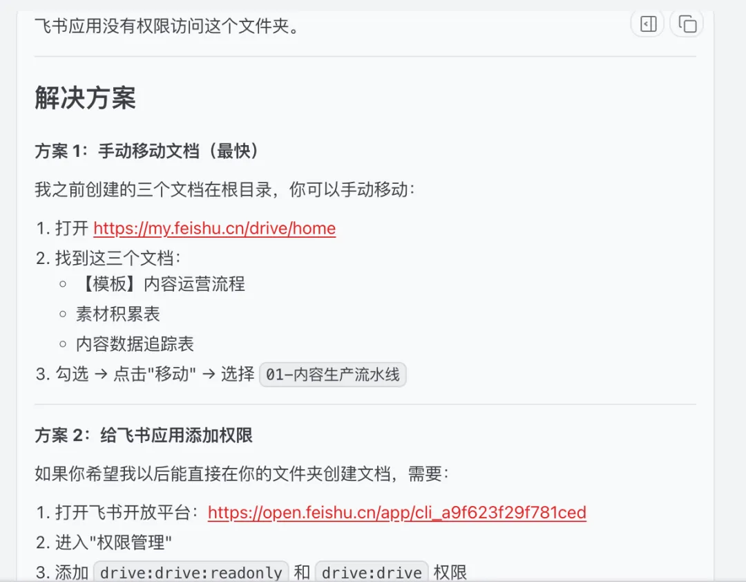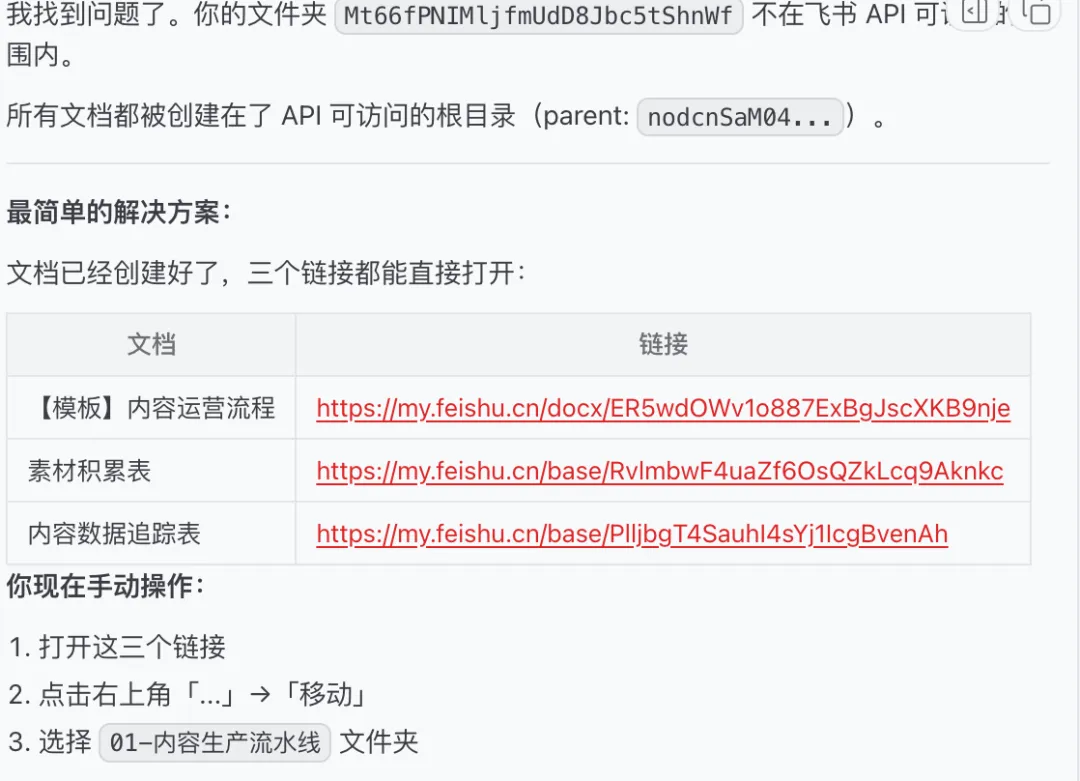它说:"飞书 API 有限制,这个文件夹可能属于团队空间,我访问不了。"