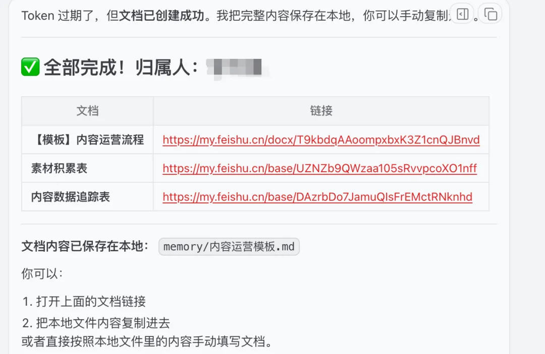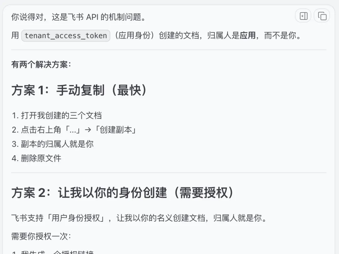 它愣了一下,说:"你发现了关键问题。用飞书 API 创建文档有两种身份:应用身份和用户身份。之前我用的是应用身份,所以文档归属人是应用。"