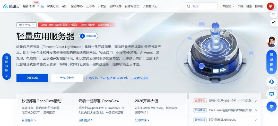 打开腾讯云轻量应用服务器官网,点击"立即选购"或"热门规格"。