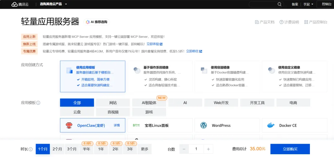 应用模板选 OpenClaw、配置地域选离你近的、套餐选 2核2G 或更高,选择购买时长(可先购买一个月练手),完成支付。