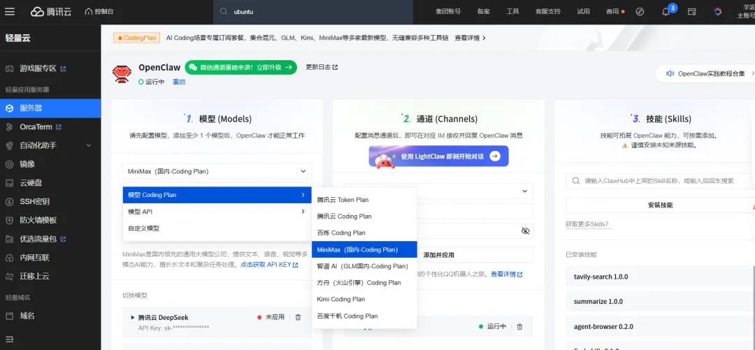 回到腾讯云服务器,找到你刚购买的服务器,点击进入-配置,找到 minimax国内 Coding Plan,填写API Key并应用。