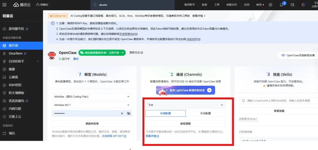在腾讯云服务器通道选择飞书,点击快速配置-前往授权,用个人飞书账号扫码等待配置完成即可。