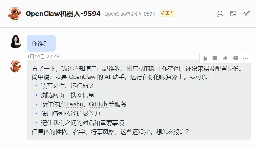 完成后直接与小龙虾机器人进行对话,如果收到回复即配置成功!