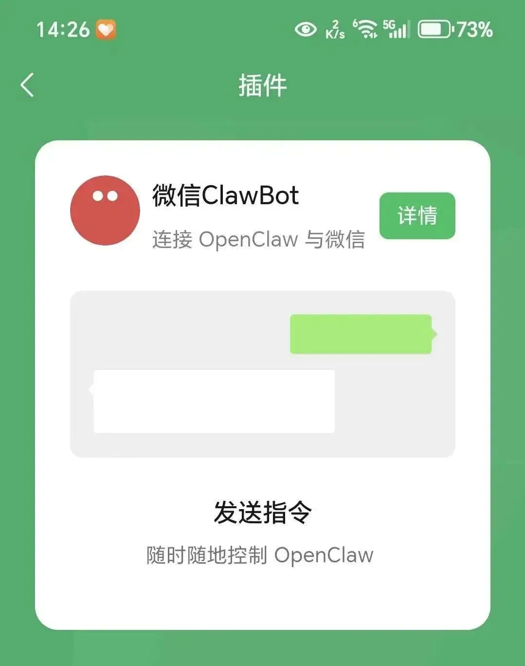 更新完成后,进入微信设置-插件,就能看到微信ClawBot插件了(没有重启一下微信),点击详情。