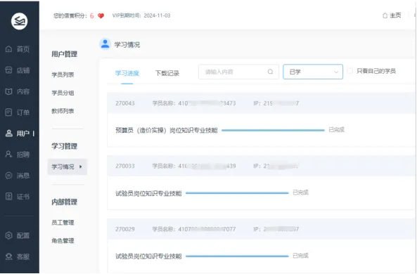 2. 点击用户—学习情况,即可查看学员学习情况