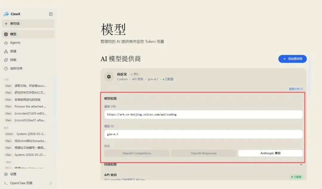 注册对应服务商账号,获取 API Key(通常在「API Keys」/「密钥管理」页面);比如我使用的是火山引擎的CodingPlan,可使用ClawX配置,监控token用量。