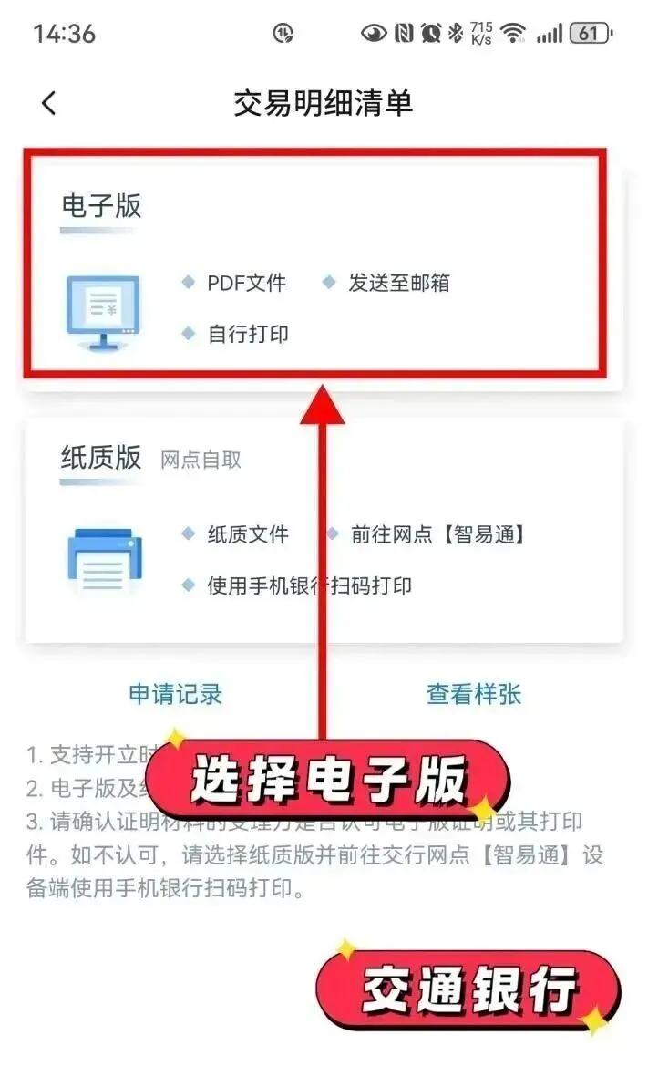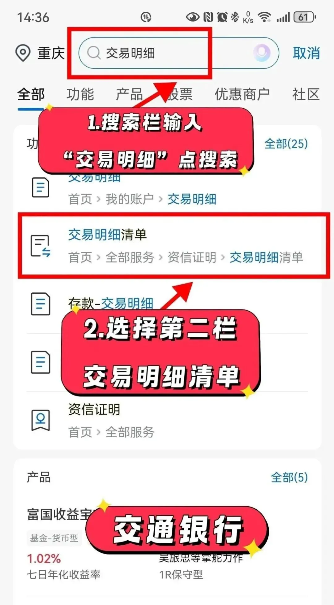 【交通银行】最详细流水下载/导出教程!一、打开交通银行APP,在搜索栏搜索“交易明细”选择“交易明细清单”选项。注意别选错了。就是这六个字,因为第一栏还有个交易明细,那是供查看使用的。二、选择电子版,点击进去。