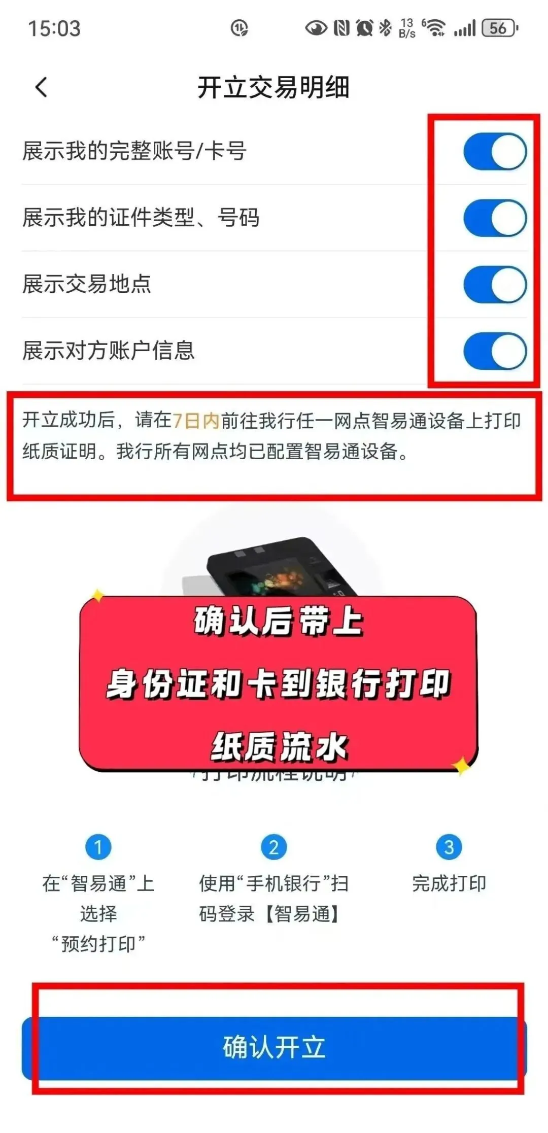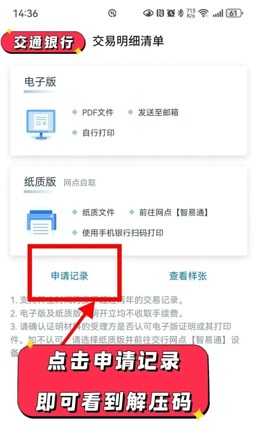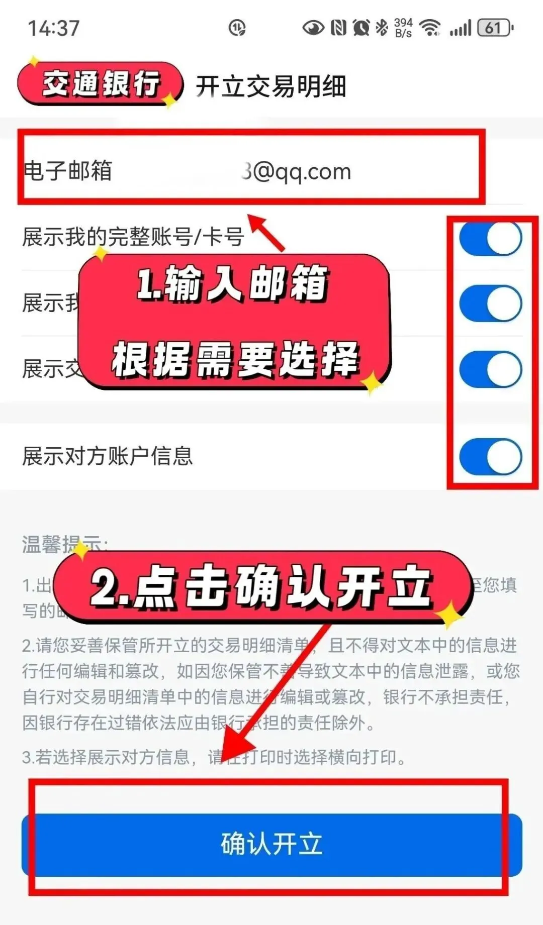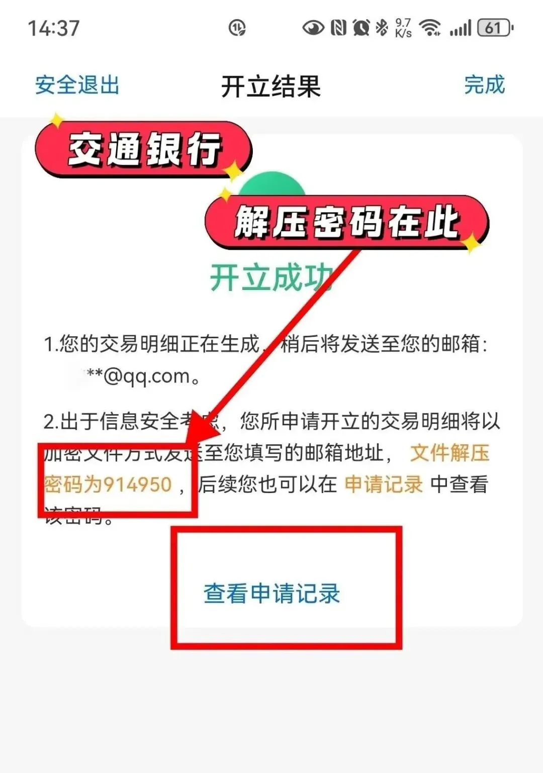 四、输入你的邮箱,将你需要的明细点击打开,完整卡号是肯定要展示的,其他的对方明细按照自己的需求选择。如果是用作银行证明的流水一般需要全部打开。选好后点击确认开立。五、提交后不要关闭窗口,可以选择截图或者记住解压码,解压码就在申请成功的页面上6.如果找不到解压码了,通过以下步骤就可以重新找到你的解压码