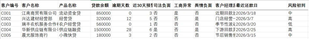 客户编号 客户名称 产品名称 贷款余额 逾期天数 近30天预警次数 司法负面 工商异常 舆情负面 客户经理反馈 最近还款日 风险初判