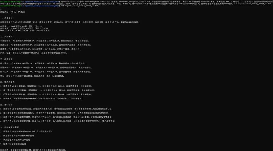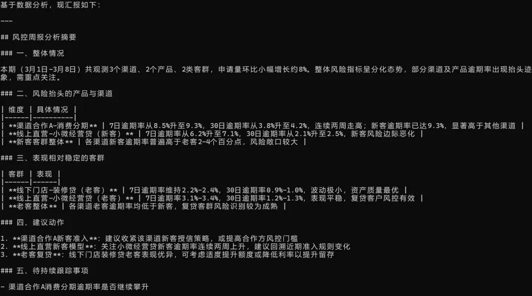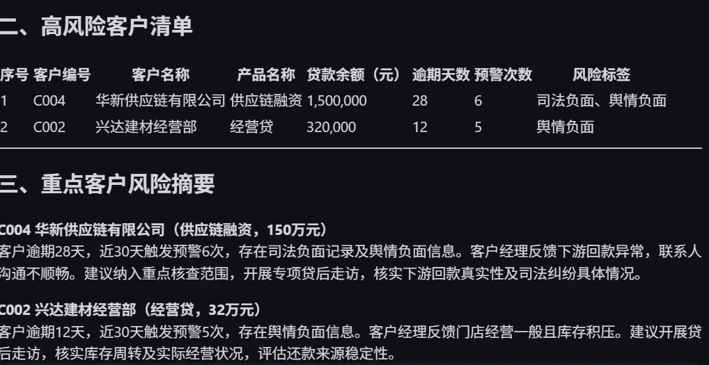 结果很直观:它已经能比较稳定地把高风险客户抓出来,并生成一版可读性不错的贷后风险简报(见下图:)。