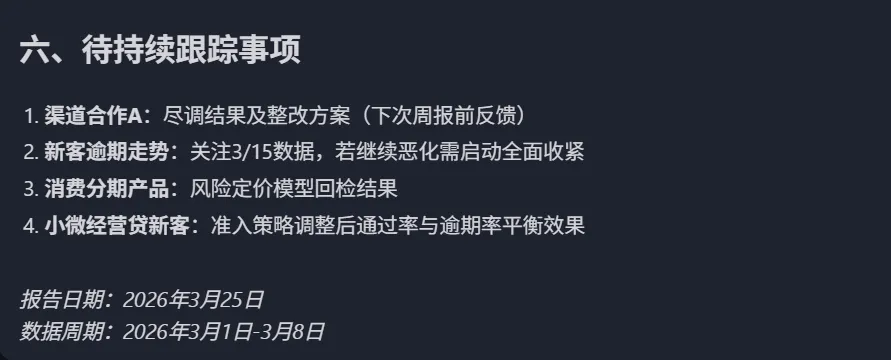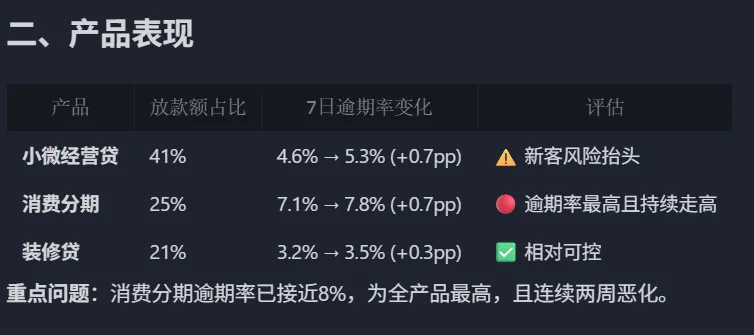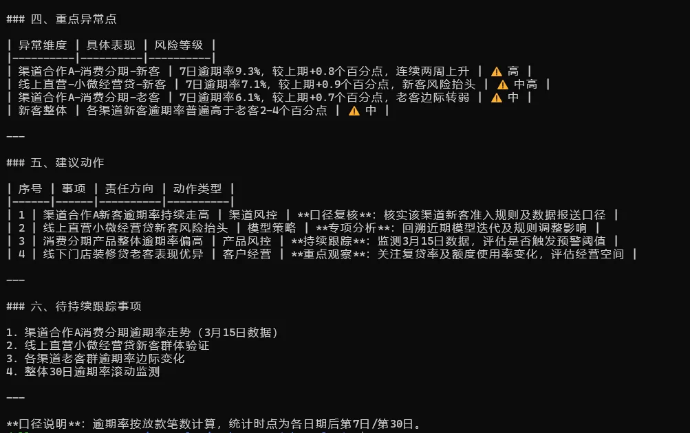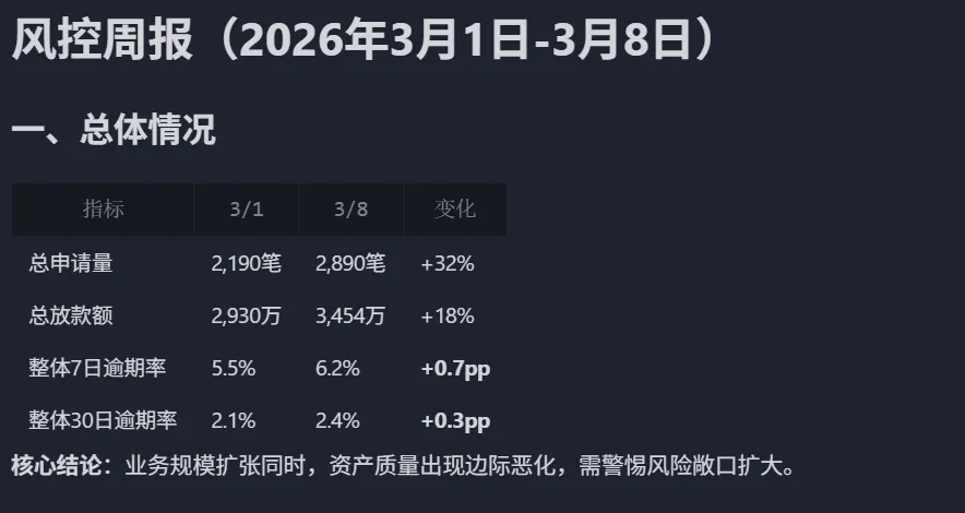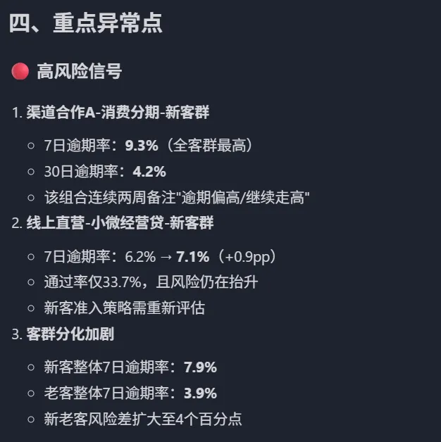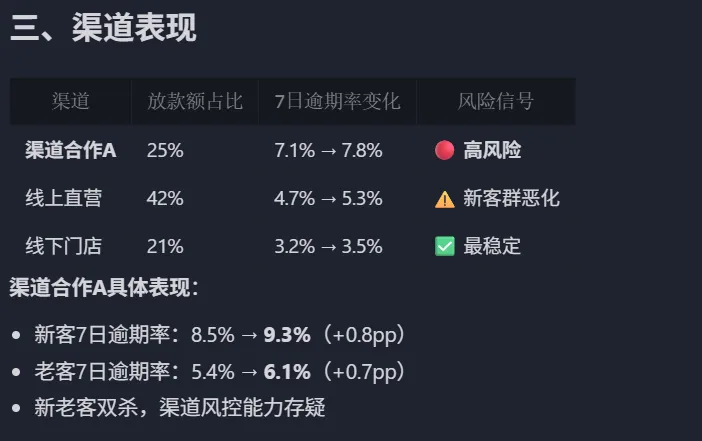 抓出了 渠道合作A抓出了 消费分期识别除了“新客风险抬头、老客相对稳定” 【继续优化:升级成风控周报草稿】