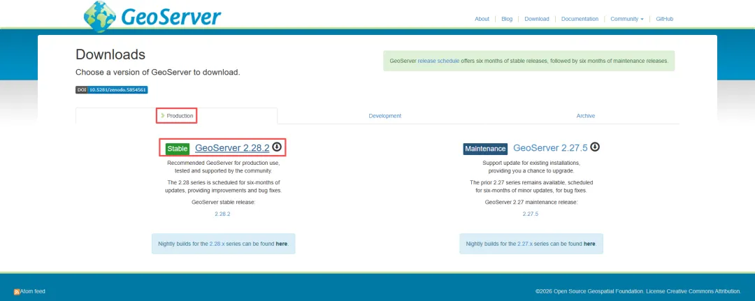 若点击Download,则进入如下界面,默认是Production选项,也就是适用于生产环境,然后点击Stable后面的GeoServer版本进行下载。