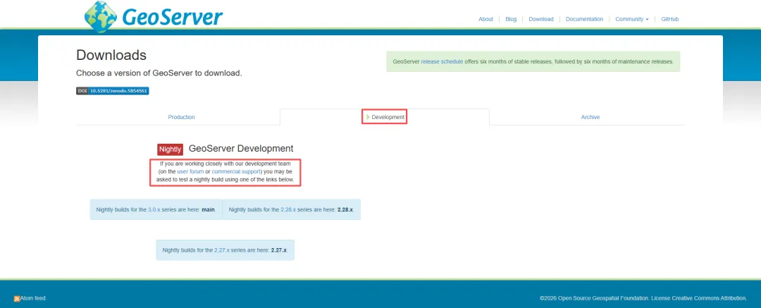 进入GeoServer官网首页,可以下载稳定版(用于生产环境)、开发版(用于开发环境)、维护版本(稳定、无新功能),可以根据自身需求下载对应版本和类型。