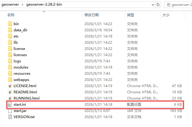 GeoServer默认端口为8080,由于在服务器或本地进行部署测试时,会存在多个服务,可能造成端口冲突,这时可以自定义服务端口。在根目录找到start.ini文件,双击打开。