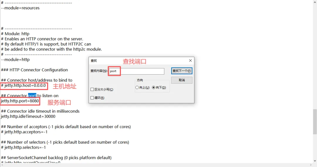 在记事本中打开查找功能,输入"port"搜索端口。找到jetty.http.port=8080行修改端口号,jetty.http.host=0.0.0.0行修改主机地址。