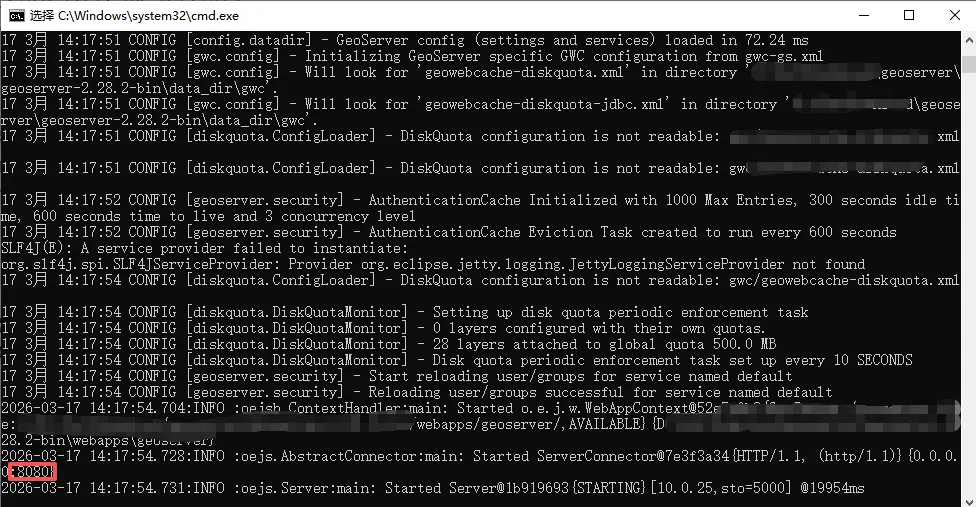 经过以上配置,可以启动GeoServer服务了。服务正常启动在命令行窗口中显示如下。