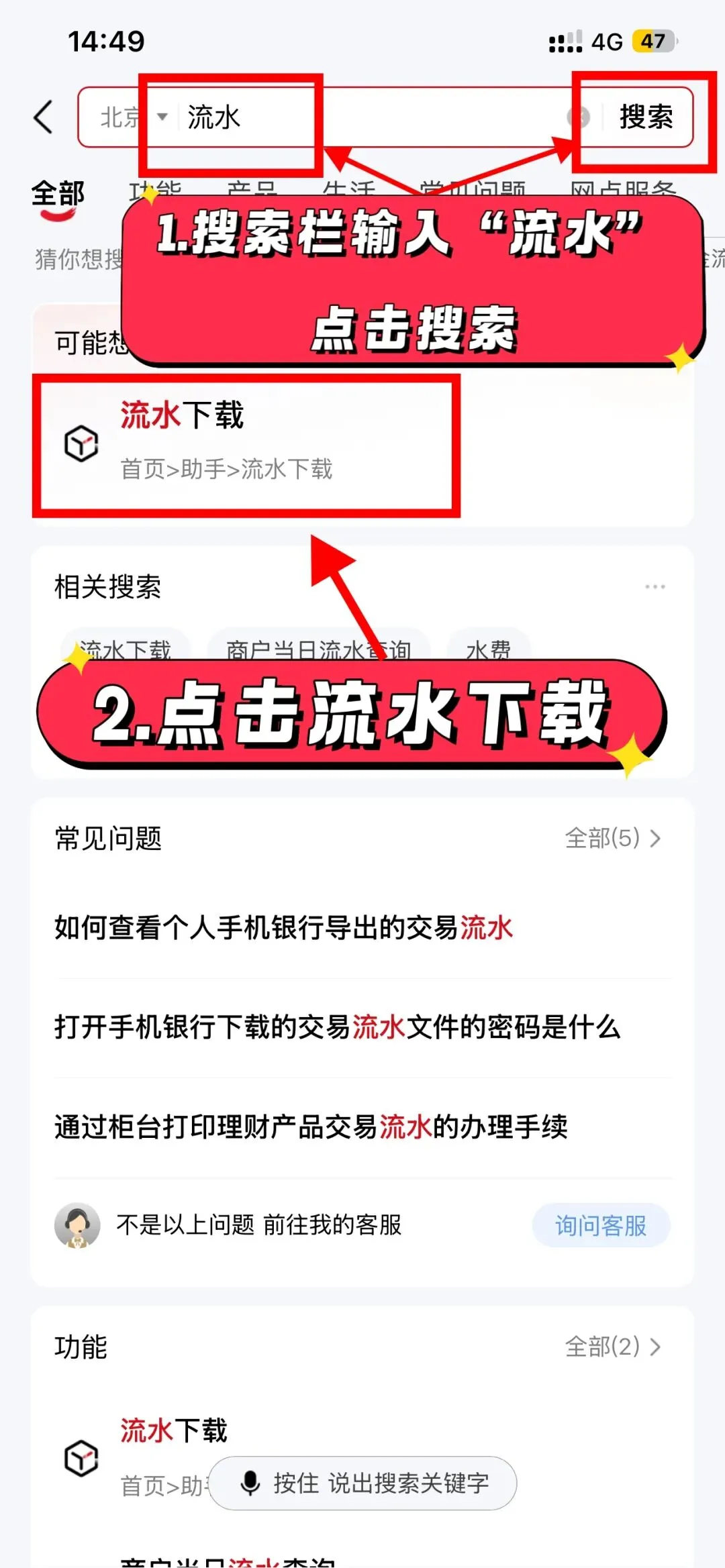 打开华夏银行的APP,在搜索栏中输入“流水”二字,点击搜索按钮,如图所示,搜索后下方会显示出“流水下载”的选项卡,点击流水下载这个选项如下图框选所示: