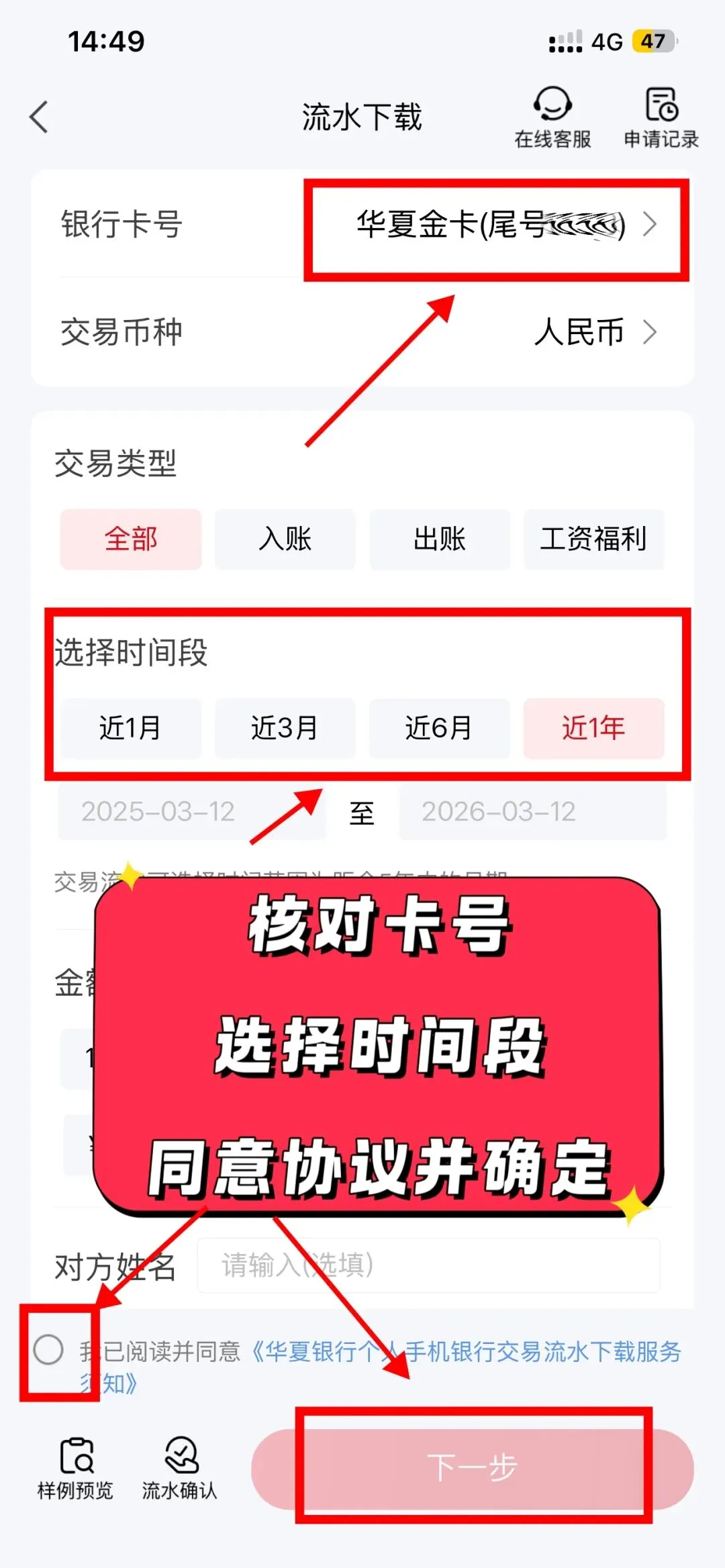 进入流水下载页面,核对卡号,选择自己需要的时间段,勾选已阅读协议,然后点击确定。如果在华夏有多张卡的,一定要把最上方的卡号核对好哟!
