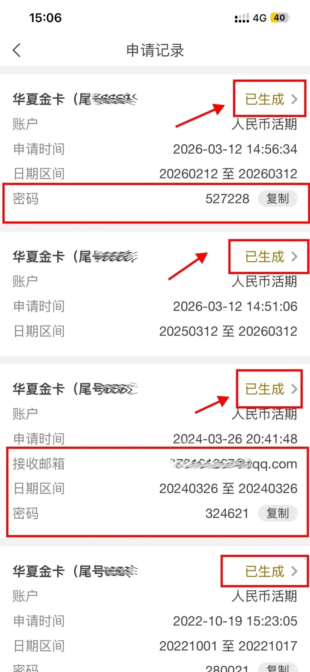 笔者的截图里有各种情况的记录:有邮箱接收的,也有自己的打开的。自己点击我框选的位置就可以。密码也是一目了然,也给大家框选了!