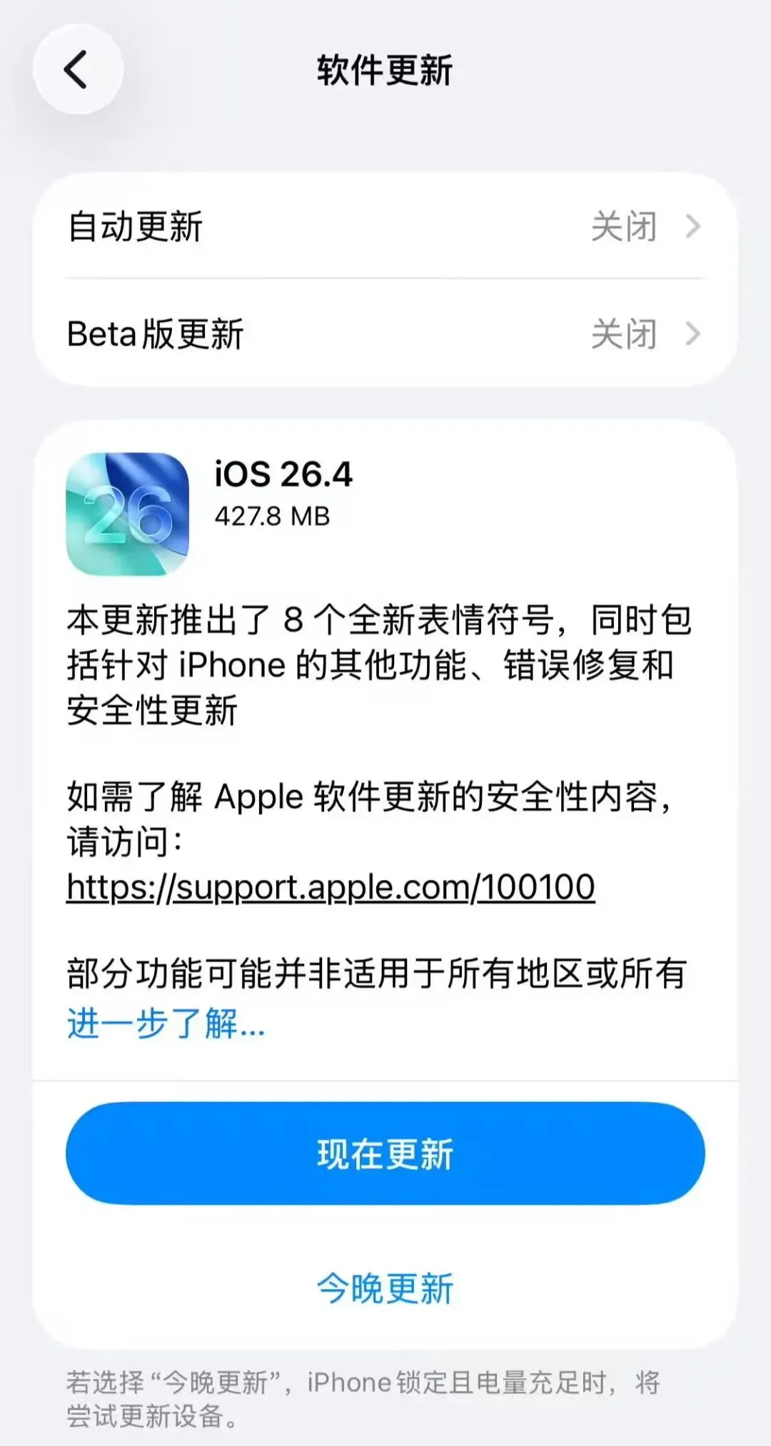 果粉们注意啦!3月25日,苹果正式推送了iOS 26.4和iPadOS 26.4正式版更新,覆盖所有支持iOS 26的iPhone(iPhone 12及以上机型)和iPad设备,主打实用性优化和功能增补,没有浮夸的噱头,全是贴近日常使用的小升级。