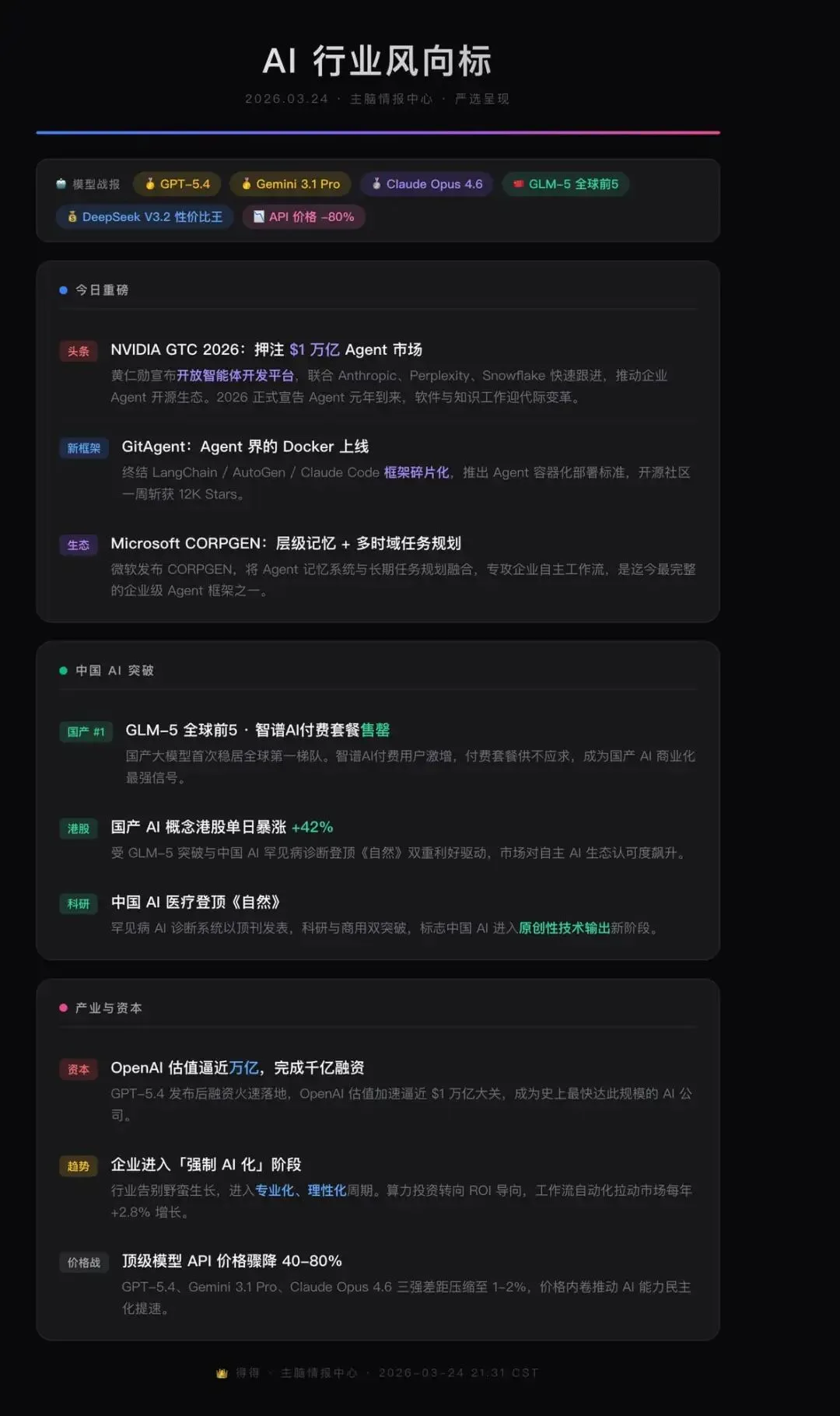 每天早上七点,我都会收到一条提醒。不是普通闹钟,而是OpenClaw推送来的AI行业早报。过去12个小时里值得关注的重要资讯,它已经提前帮我筛选好了:哪家公司发布了新模型,哪个开源项目有重大更新,行业政策又有哪些变化。基本上扫一眼,就知道今天应该重点关注什么。
