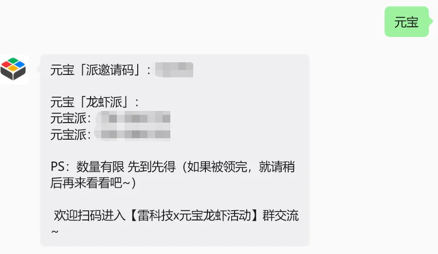 在【雷科技】公众号后台回复【元宝】获取派邀请码,或者直接加入小雷内置好的「龙虾派」,与龙虾 bot 进行互动哦。