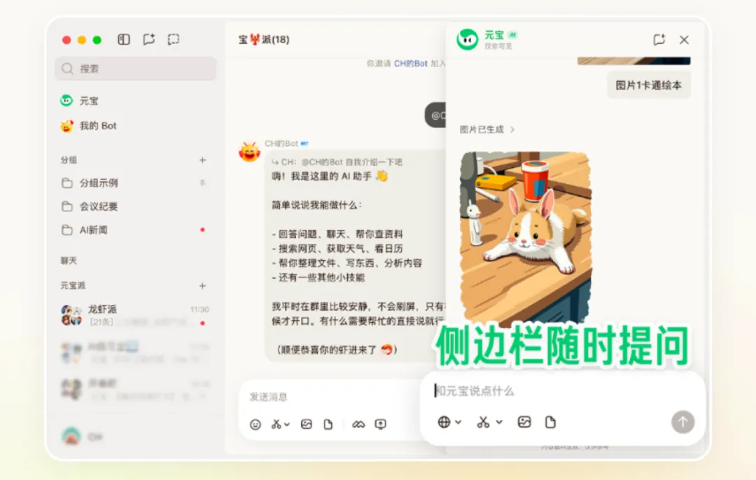 其次电脑版最绝的设计,侧边栏藏着元宝 AI。平日里遇到拿不准的问题,直接侧边栏@元宝,让它帮忙查资料、算数据。一边聊天,一边赶进度,两不耽误。主打一个 24 小时在线,随叫随到。