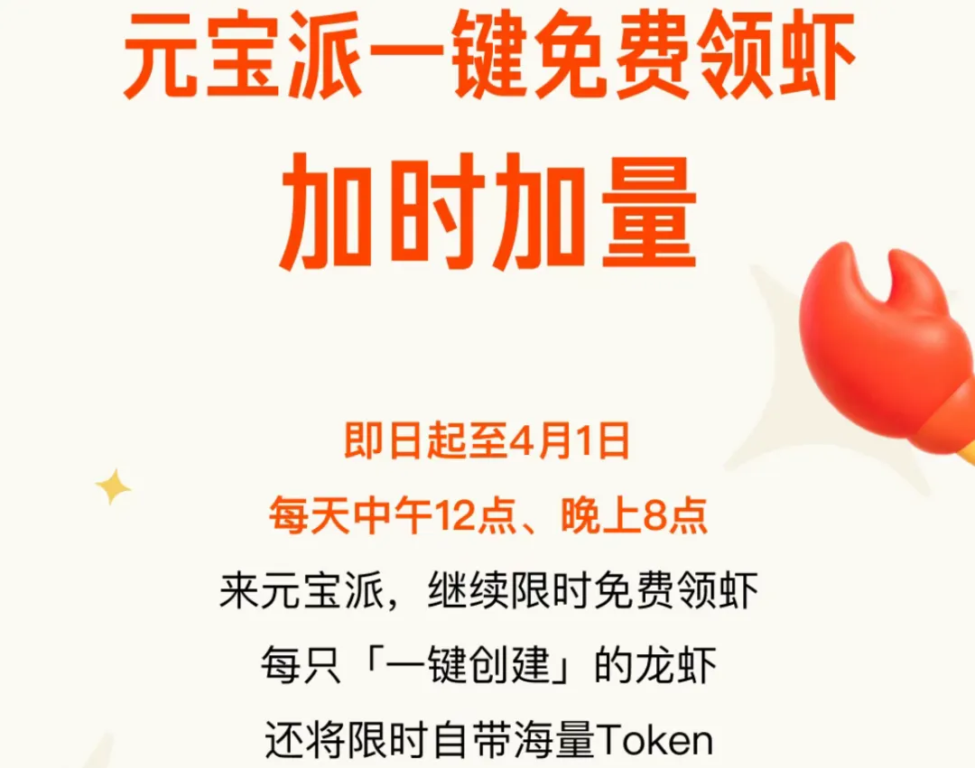 而且小雷前面提到的“一键养虾”也可以安排,拉进群里和派友一块养。当个办公小助手的同时,还能当个气氛组。没有“虾”的小伙伴也别急,3 月 24 日至 4 月 1 日,每天中午 12 点、晚 8 点都能限时免费到元宝派领虾,还自带海量 Token 哦。
