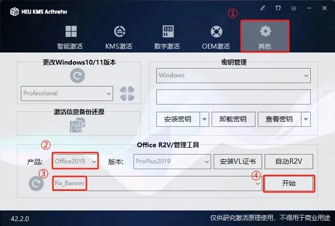 6.修复许可证弹窗:点击【其他】,产品选择【Office2019】,选择【Fix_Banner】,点击【开始】。