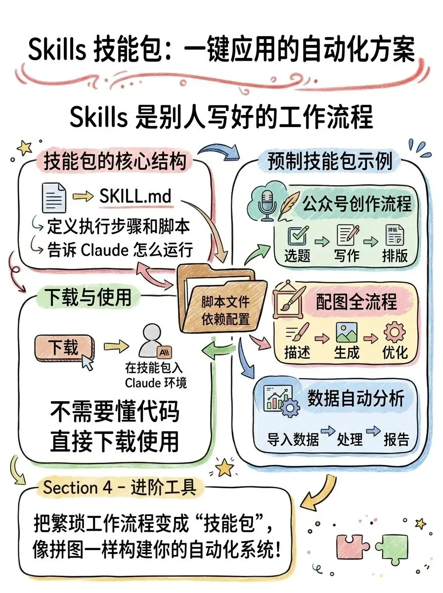 Skills 就是"技能包",别人写好的一套工作流程,你下载下来直接用。