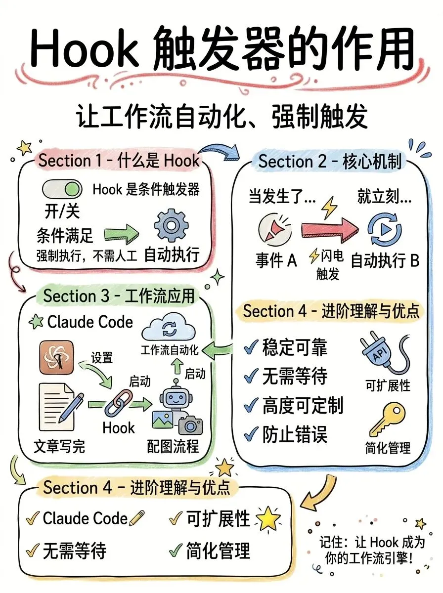 其实也不复杂。Hook 是强制的,条件到了自动跑,不需要人判断;CLAUDE.md 里的指令更灵活,Claude 会来问你要不要做。