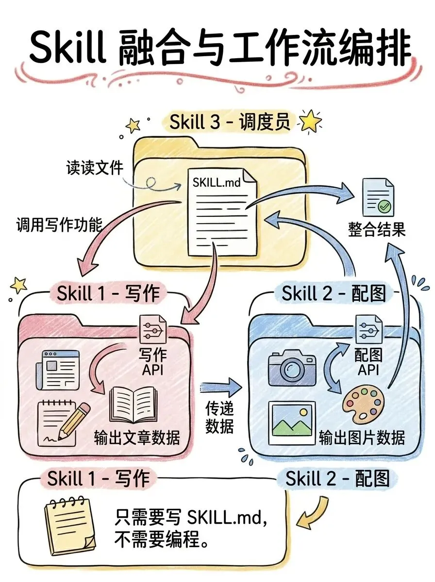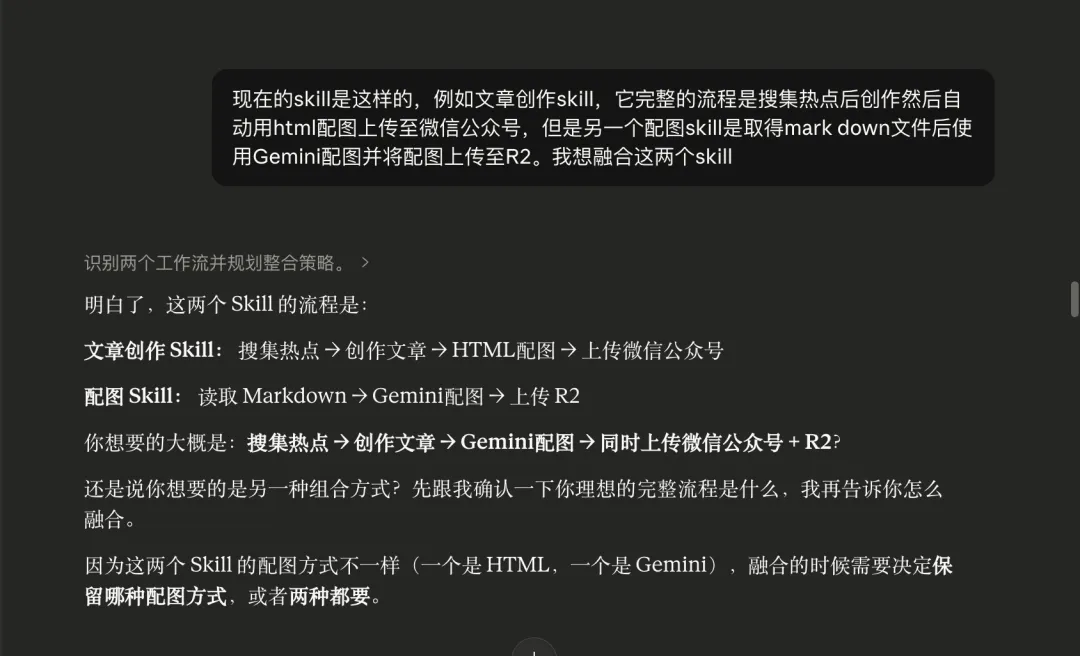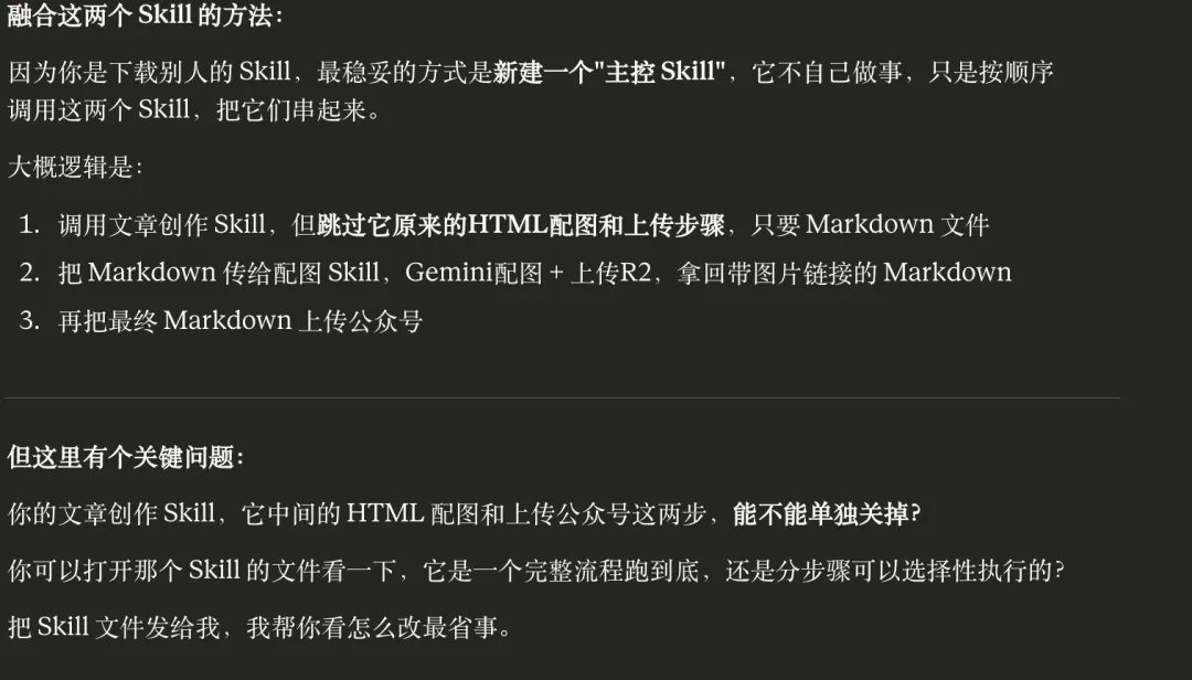 1. 调用 Skill A 的写作部分(跳过它的配图步骤) 2. 把文章传给 Skill B 配图上传 3. 拿到带图片链接的 Markdown,再发布到公众号