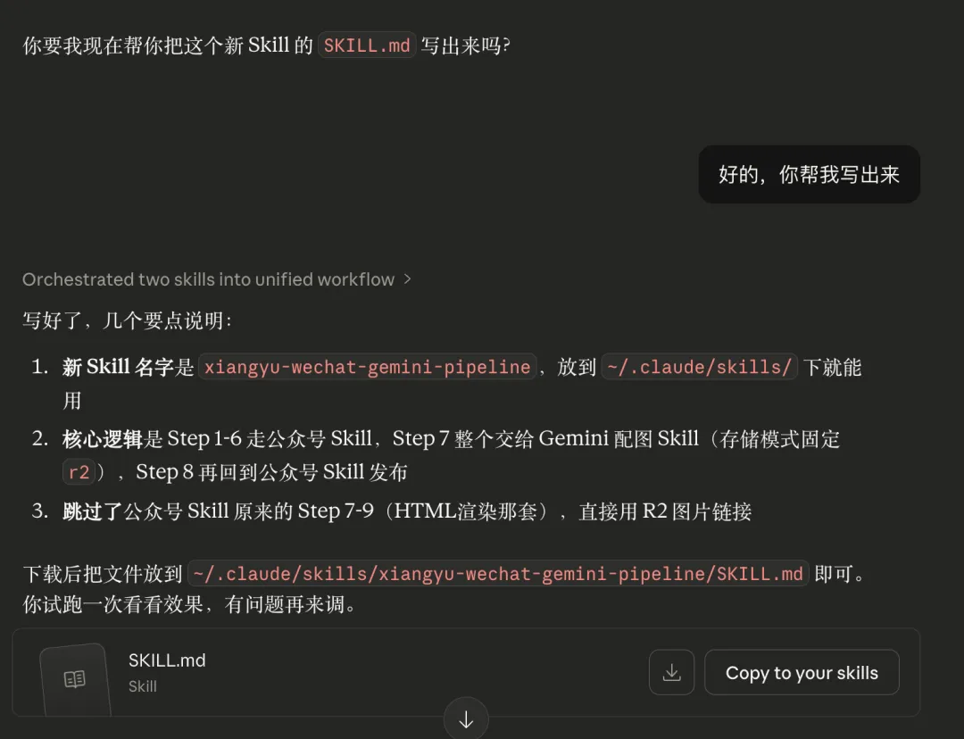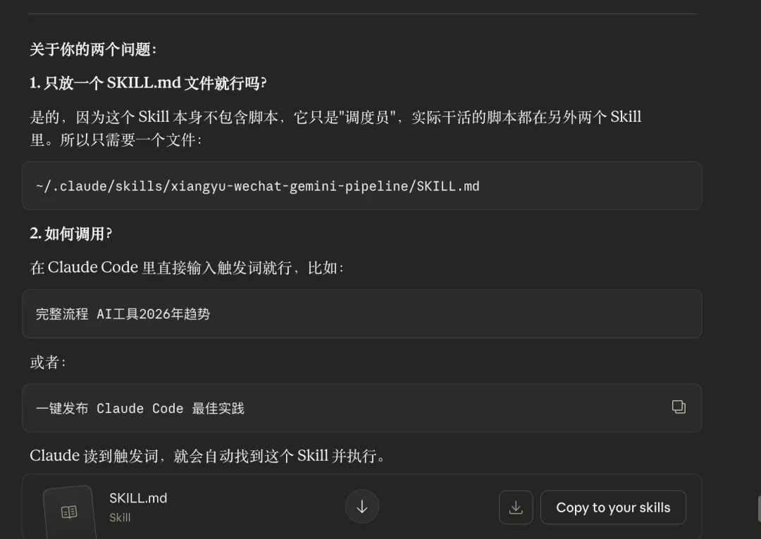 它的解决方案就是在重新写一个 skill.md 文件就可以了。这个 skill.md 文件就放在~/.claude/skills/xiangyu-wechat-gemini-pipeline/SKILL.md 文件夹中就可以直接调用了。
