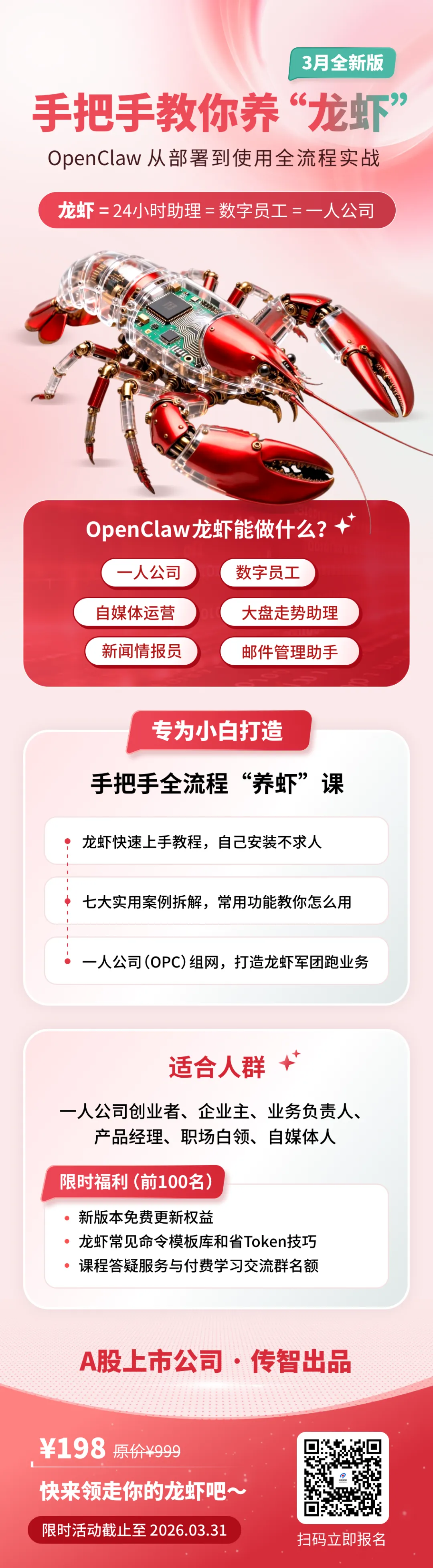 传智教育联合一线AI实战专家,推出专为小白打造的「手把手教你养“龙虾”」课程。